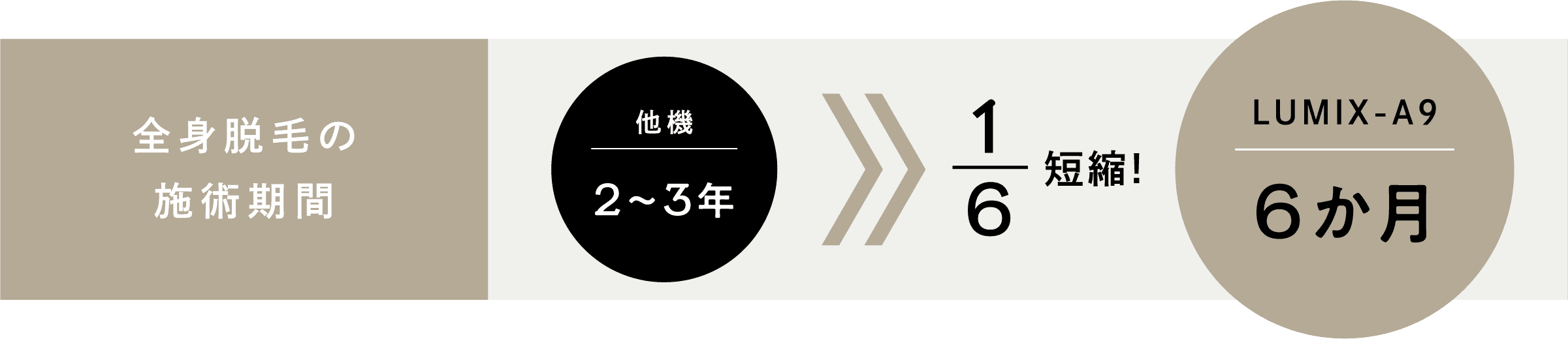 【1秒間に10回照射】が可能である点も、LUMIX-A9の⼤きな特徴です。 しっかりと重ね打ちを⾏うことで、光の当てムラを防ぎ、脱⽑の仕上がりを美しく整えます。 また、【1秒間に10回照射】によって、施術時間が短いのも特徴です。従来の脱⽑機だと、全⾝脱⽑の所要時間は180分ですが、 LUMIX-A9なら全⾝でも60分で完了します。